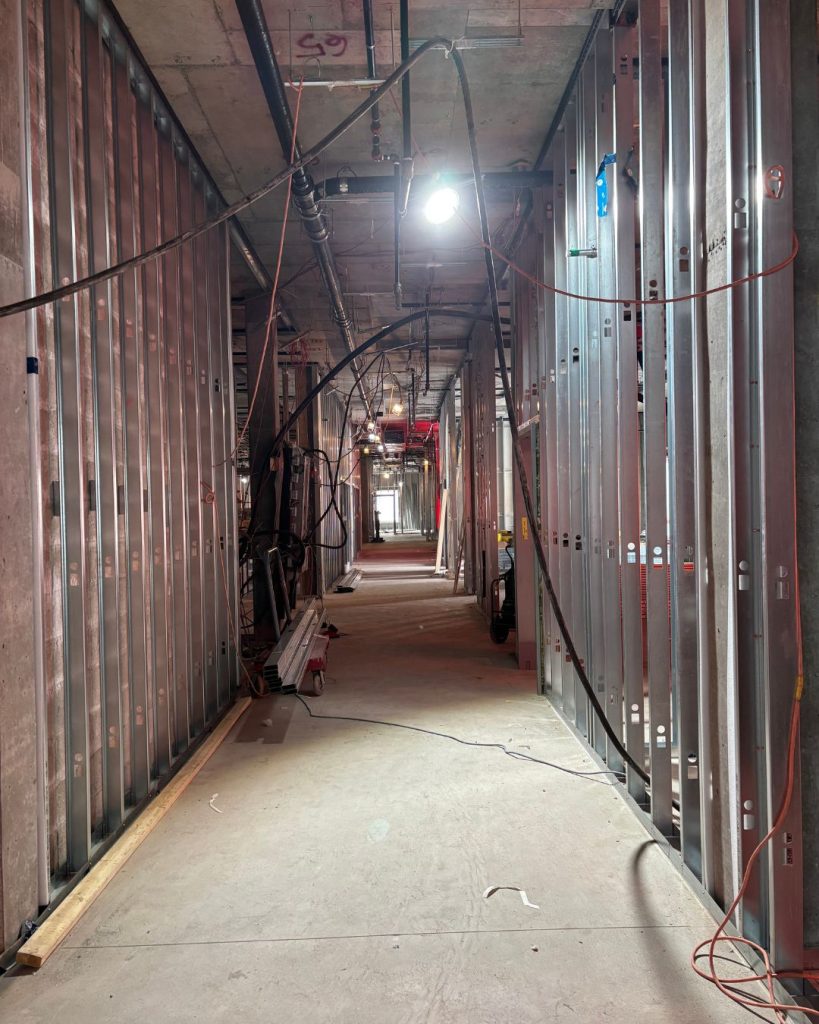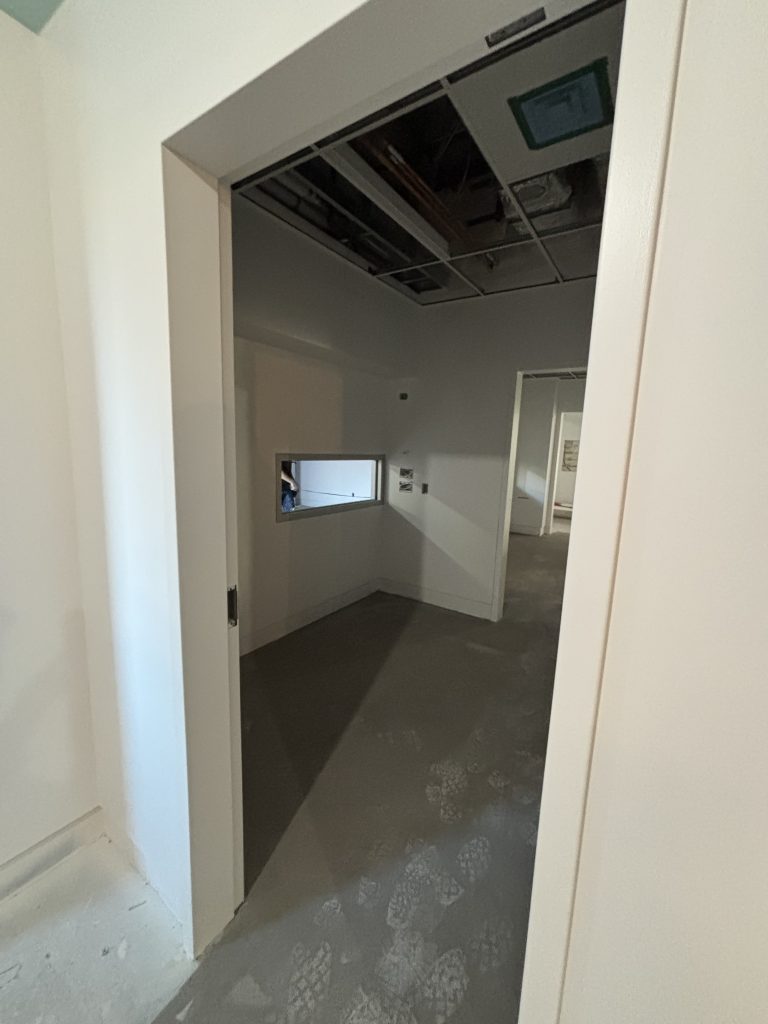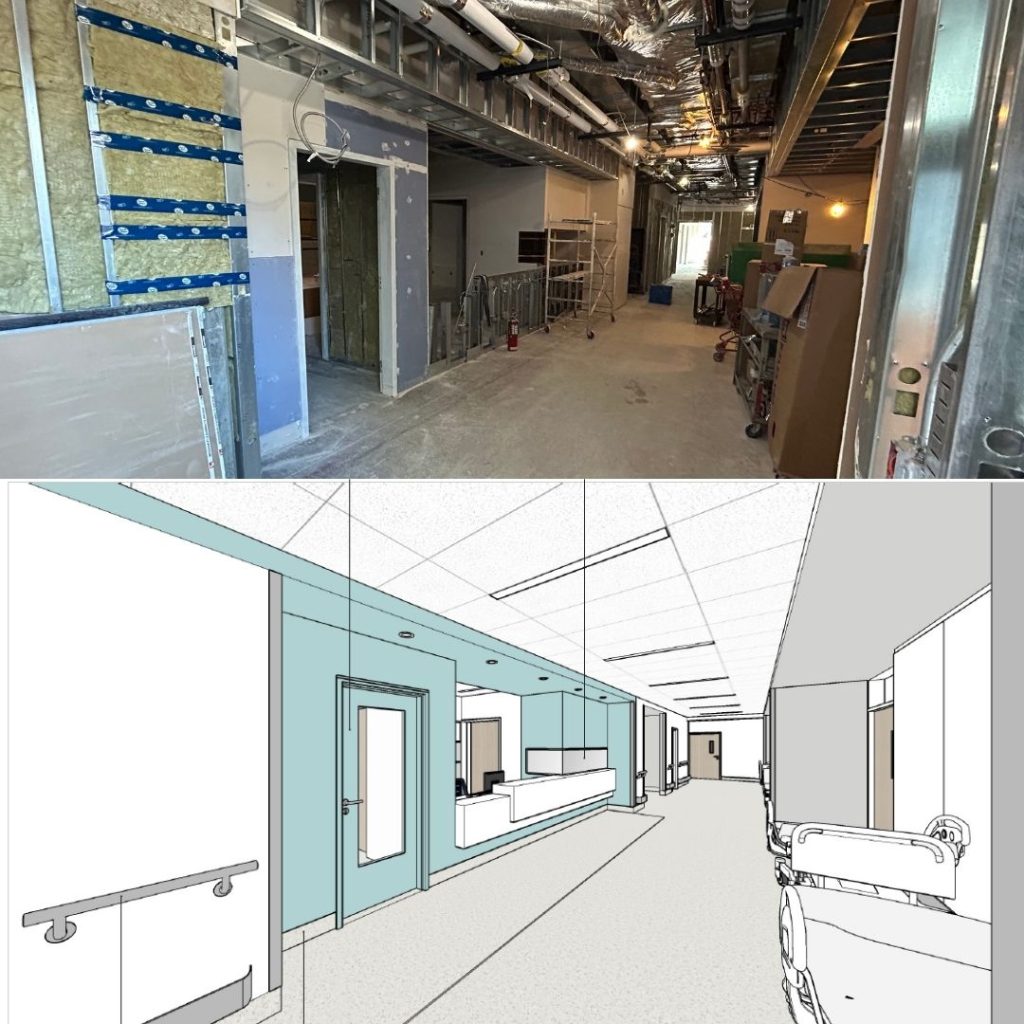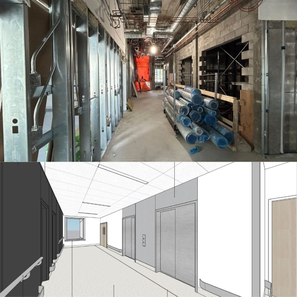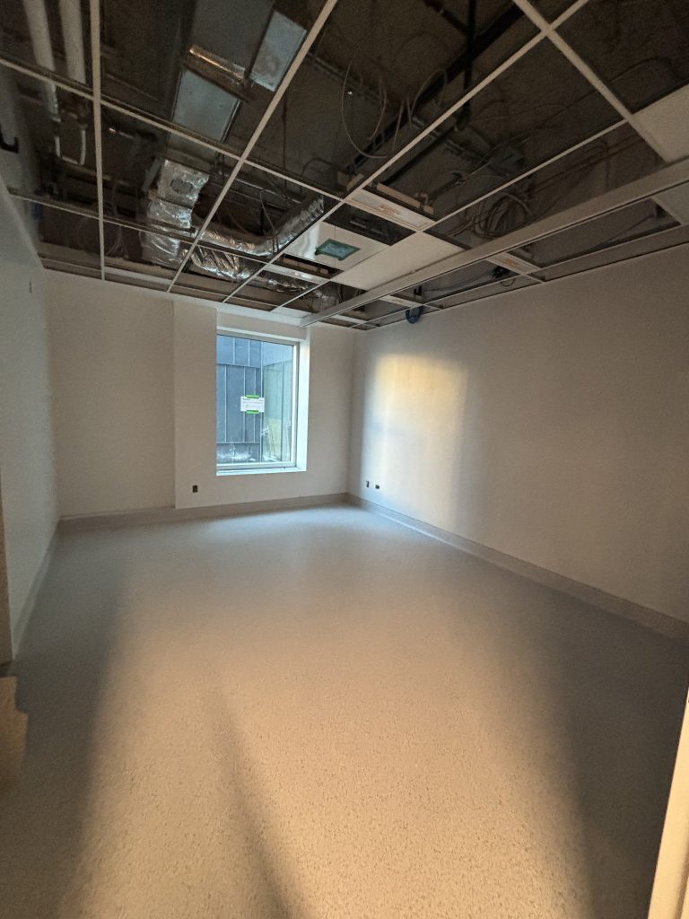 Il peut être difficile de se projeter, mais voici quelques photos de l’intérieur du Pavillon J. Vous pouvez voir la taille des fenêtres et des corridors, un future salle de repos, une future chambre double, l’entrée du personnel (avec les escaliers à l’intérieur plutôt qu’à l’extérieur!).
